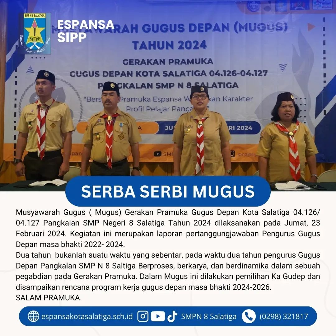 Telah dilaksanakan Musyawarah Gugus Depan (MUGUS) Tahun 2024 Gerakan PRAMUKA Gugus Depan Kota Salatiga 04.126-04.127 Pangkalan SMP Negeri 8 Salatiga pada hari Jum'at tanggal 23 Februari 2024 dengan tema "Bersama Pramuka Espansa Menjadikan Karakter Profil Pelajar Pancasila".